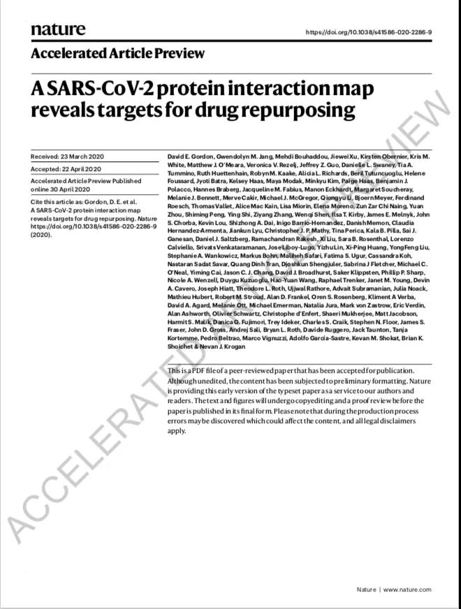 周元参与的这篇论文题目为“A SARS-CoV-2 protein interaction map reveals targets for drug repurposing”(SARS-CoV-2蛋白相互作用网络揭示药物再利用的靶点),论文根据研究数据绘制出蛋白质-蛋白质相互作用网络,并根据此网络发现了69个已知的潜在COVID-19呼吸系统疾病的候选药物(化合物),为获得COVID-19呼吸系统疾病的治疗方案提供了可能性。周元主要负责数据分析和可视化的工作,对在实验中获得的数据进行统计分析和聚类分析,并给出分析结果的可视化图,绘制蛋白质-蛋白质相互作用网络图。